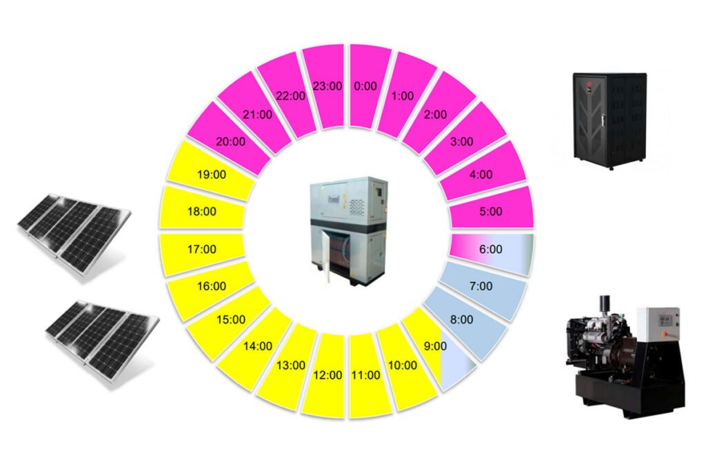 Como se puede observar, HYB-ENERGY permite disminuir las horas de funcionamiento del grupo electrógeno alternando períodos que funciona “en parado” mediante la energía almacenada en las baterías. Cuanto mayor sea el apoyo solar fotovoltaico menores serán los arranques del grupo electrógeno.