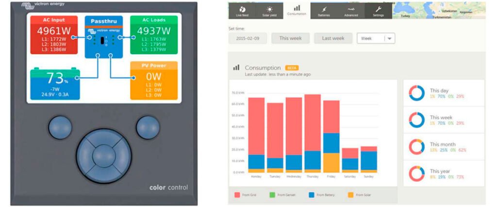 Ello es posible gracias al inversor-cargador de VICTRON, que convierte la corriente alterna que genera el grupo electrógeno en corriente continua susceptible de ser almacenada en baterías.
